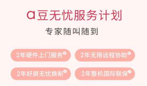 为了让你的使用体验更加无忧,它还提供了a豆无忧服务计划,包括2年硬件专家上门服务、2年无限远程协助、2年好屏无忧换新、2年整机国际联保,偶发蓝屏死机、电脑中毒、网络卡顿等小问题,专业工程师远程操机,硬件故障直接上门维修,全面提升用机安心度。